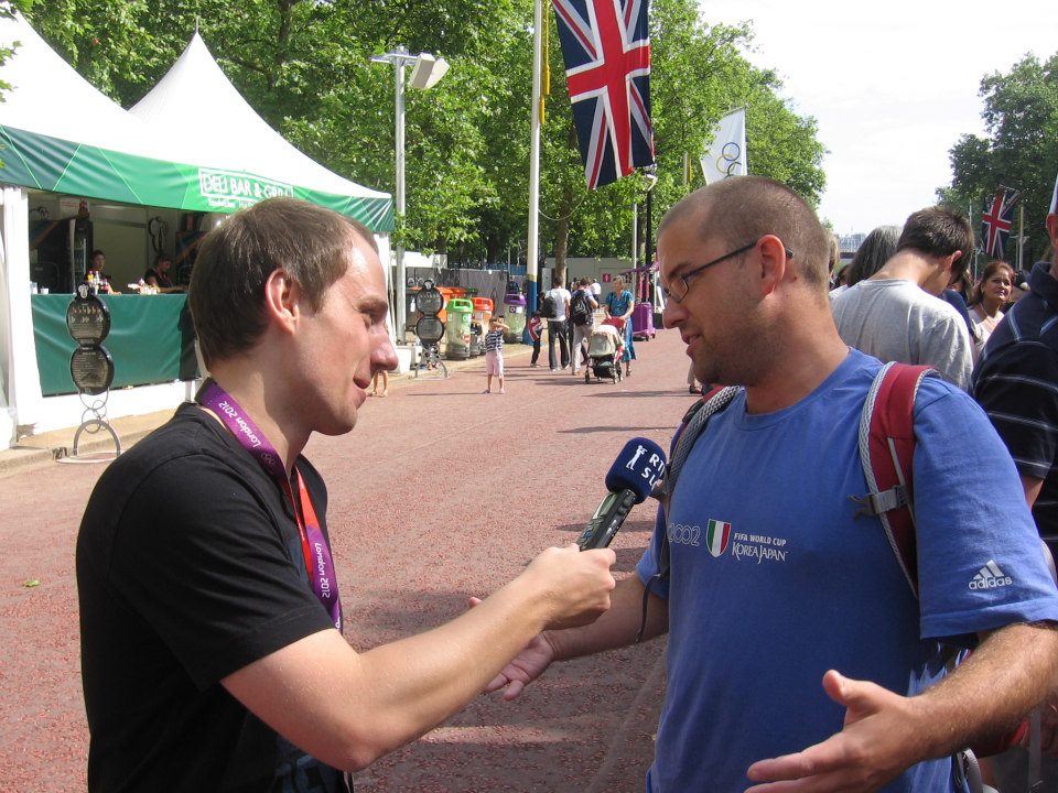 Jonty mid interview with a Serbian radio station at the Marathon