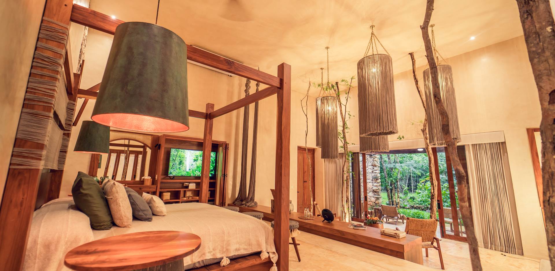 The hotel’s 12 exclusive villas are nestled amid the delicately preserved jungle. Some villas have been beautifully designed around the jungle and trees, where tree trunks can be found within the villas, bringing the outside in. The hotel’s spaces are natured inspired yet modern in design with woven rattan and open stone walls.